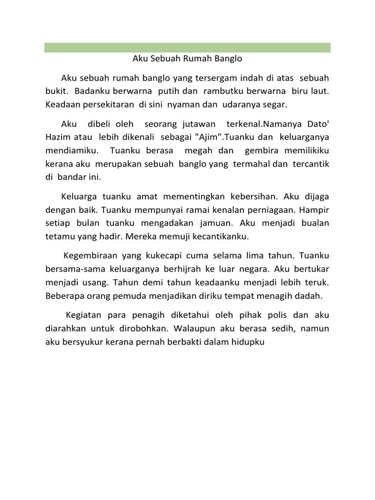Impian saya adalah menjadi seorang jutawan. Aku SebuaH Rumah Banglo Aku sebuah rumah banglo yang tersergam indah di atas sebuah bukit. Tanpa ibu kita tidak mungkin lahir ke dunia ini.
